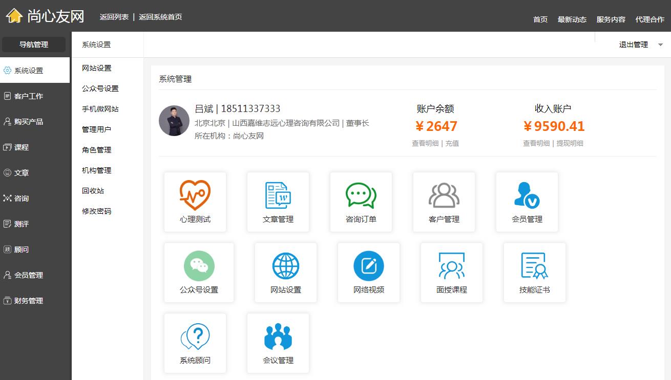 心理导读: 感谢您对我尚心友网的认可,我们定位于为心理服务机构提供互联网解决方案,由此我们的服务主要有以下五大类 凡是建立合作的心理服务机构,签订合作协议,都可以免费获得一套心理服务机构管理系统,如图: 包含 (一)系统设置: 包含权限设置,角色管理,网站设置,微信公众号搭建和设置,手机微网站,回收站,修改密码 (二)客户工作 包含客户来源管理,客户管理(今日回访,过期回访,重点客户,黑名单客户等),任务管理,...—www.52psy.cn