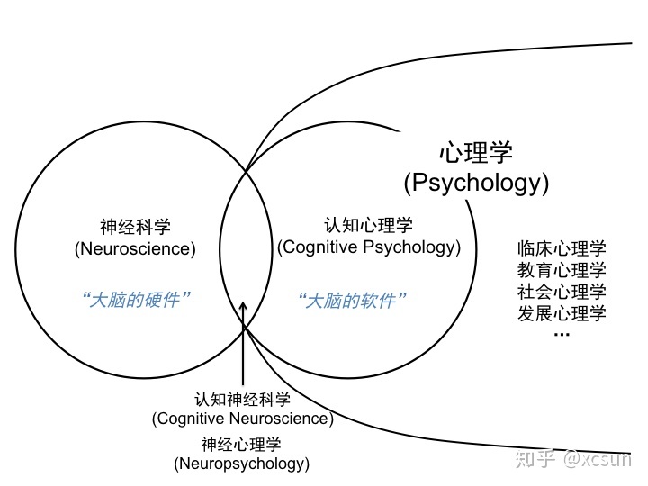 心理学则是一个“一级学科”,所以包含的方面和分支更广。心理学研究广泛涉及各种人类心理、精神和行为,其中和“神经科学”关系最近的分支学科是“认知心理学”(研究人大脑的认知过程),但也包含其他分支如偏应用的临床心理学、教育心理学,研究社会行为的社会心理学,研究儿童成长的发展心理学等等。